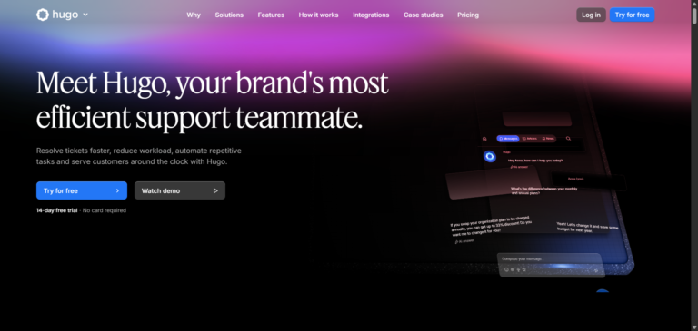 Hugo is an AI customer support automation tool that handles repetitive conversations, reduces ticket volume, and scales support operations. Ideal for SaaS, ecommerce, and fast-growing businesses.